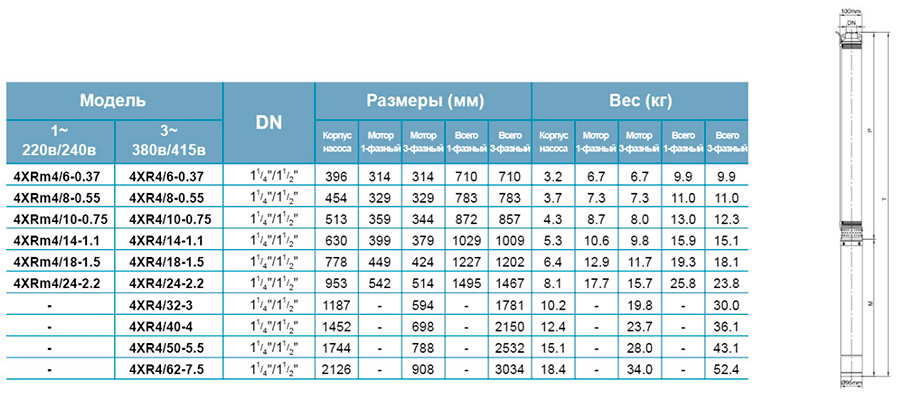 Минимальный диаметр скважины: 4 дюйма.
